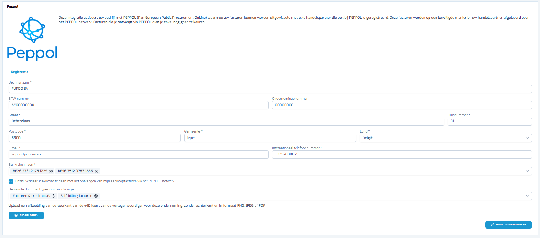 U dient onderaan ook een afbeelding van de voorkant van de e-ID kaart van één van de wettelijke vertegenwoordiger van de onderneming in PNG, JPEG of PDF formaat up te loaden. Dit kan via de knop E-id uploaden. Tenslotte kan u de PEPPOL registratie bevestigen via de knop Registeren bij PEPPOL. Hierna wijzigt de status naar In evaluatie.