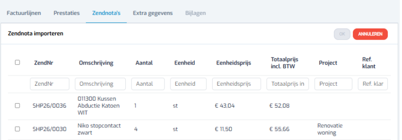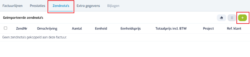 Opmerking: Naast zendnota’s kunt u altijd ook Prestaties en andere Artikelen toevoegen aan dezelfde factuur.