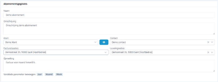 Hier kunt u variabele parameters gebruiken, zodat er automatisch op de factuur vermeld wordt over welk jaar, maand of week deze gaat. - Bedrag van het abonnement – Vul in