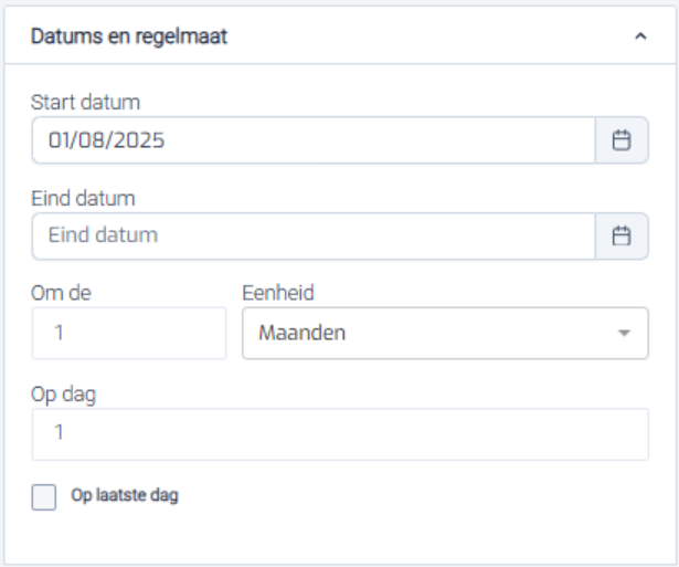 - Wilt u dat de factuur altijd op de laatste dag van de maand wordt aangemaakt? Vink dan de checkbox Op laatste dag aan.