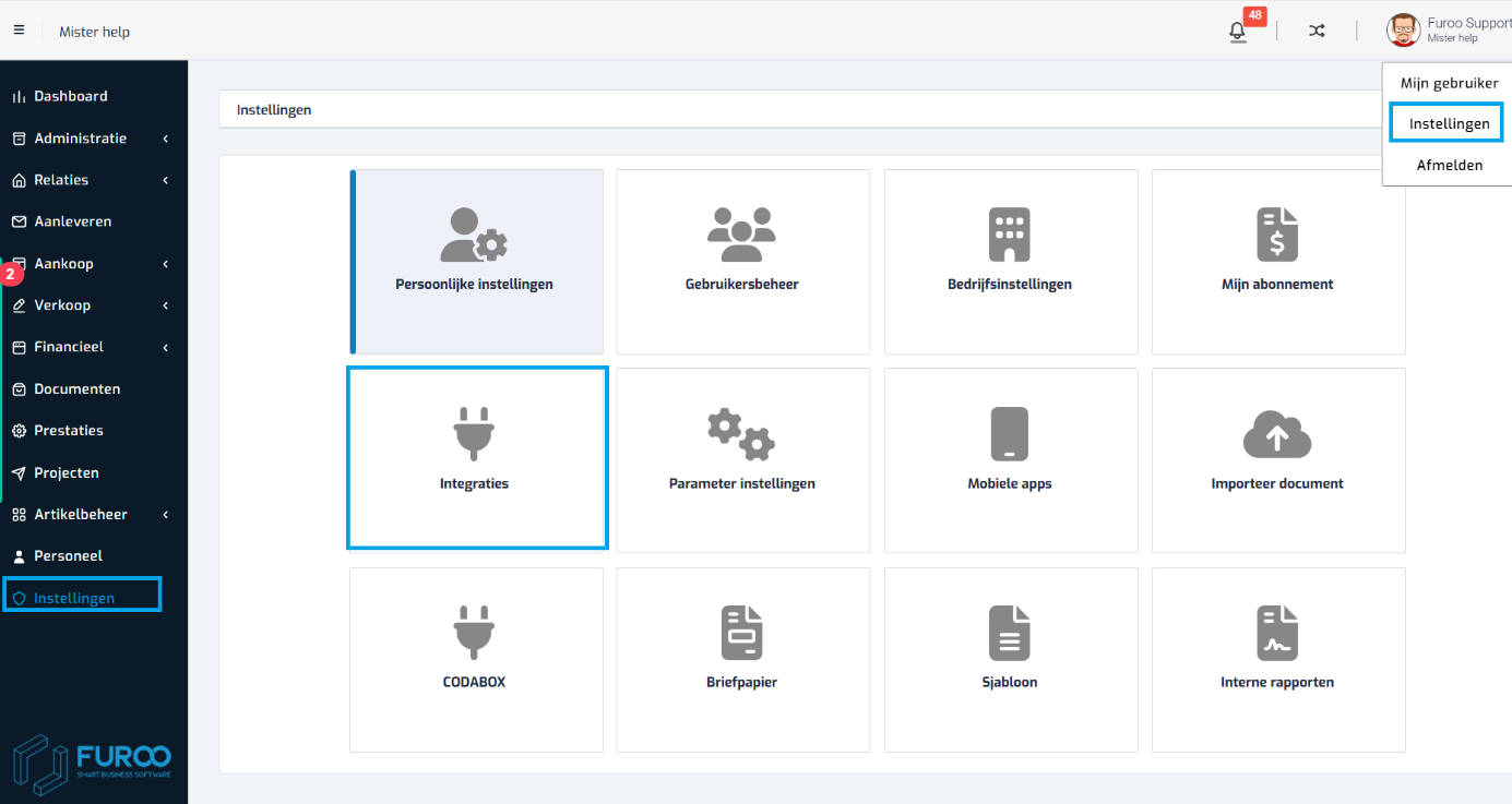 Dit kan u als volgt uitvoeren: U kiest voor Instellingen in het linkermenu of rechtsboven op uw naam klikken > Instellingen. Daar klikt u op de tegel Integraties.