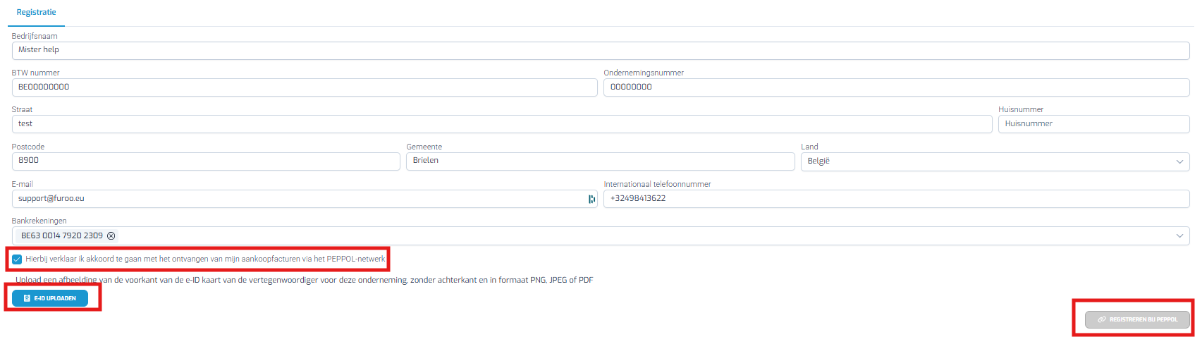 Na het openen van dit tabblad komt u terecht in het registratieformulier voor PEPPOL, waarin u alle gevraagde gegevens invult (Bedrijfsnaam, BTW-nummer, Ondernemingsnummer, Adresgegevens, E-mailadres, Telefoonnummer, Bankrekeningen).