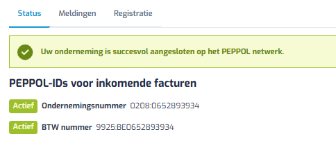 Alle gegevens worden nadien gecontroleerd en u ontvangt een mail zodra u actief bent op PEPPOL. U kunt uw status ook steeds terugvinden onder de PEPPOL tegel. Daar kunt u ook uw PEPPOL ID terugvinden. Zodra uw identiteit geverifieerd is, zal u dit terugvinden onder het tabblad Status