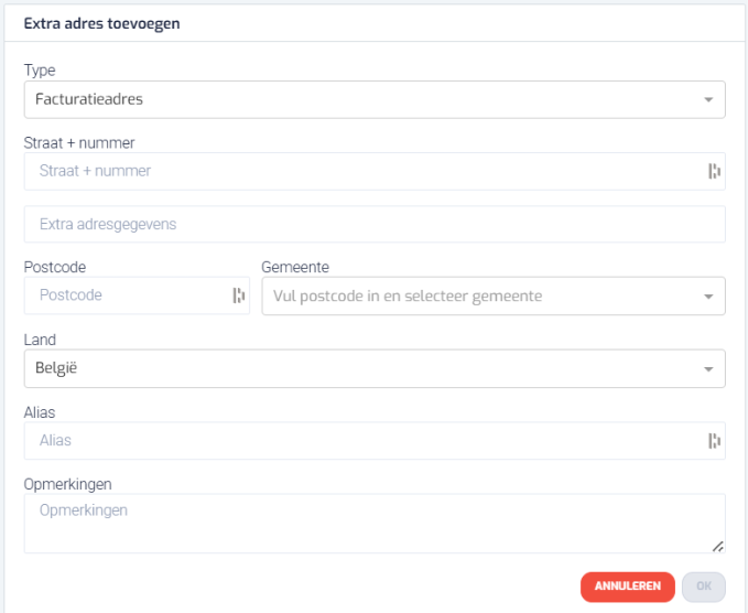 - (Optioneel) Alias: een korte tekst die naast het adres wordt weergegeven. Dit is handig wanneer er meerdere facturatie- of leveringsadressen zijn.