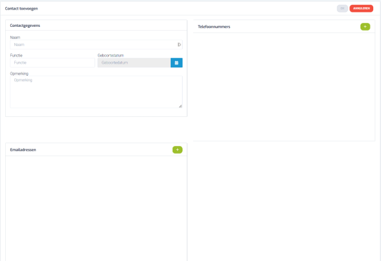 - Vul de contactgegevens in: naam, functie en eventueel geboortedatum en interne opmerkingen.