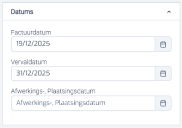 Hier stelt u de factuurdatum en de vervaldatum in. Optioneel kunt u ook een afwerkingsdatum of plaatsingsdatum toevoegen.