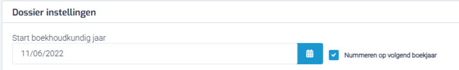 In het paneel Dossier instellingen ziet u het veld “Start boekhoudkundig jaar”.