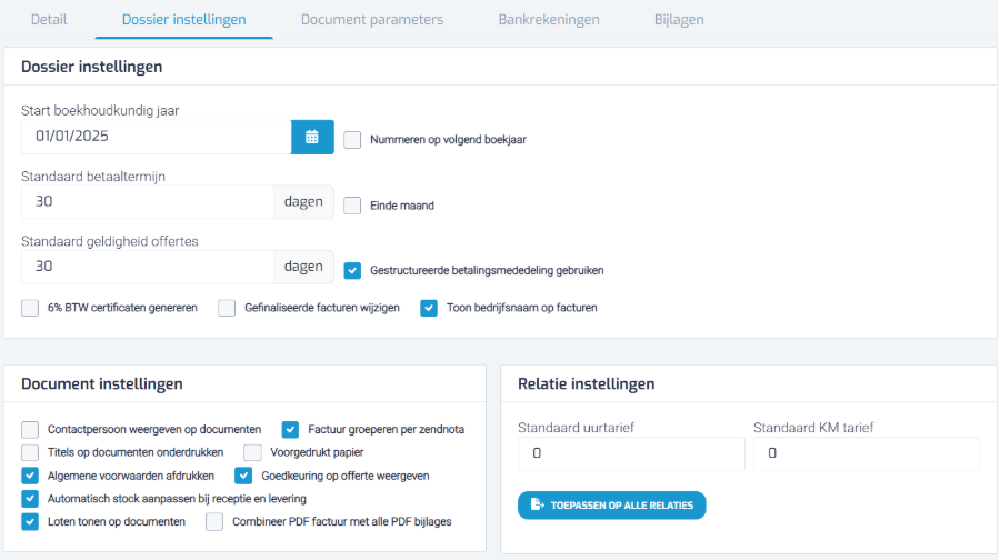- Ga naar Instellingen > Bedrijfsinstellingen en open de tab Dossierinstellingen.