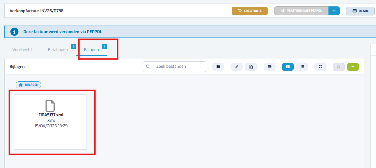 - In het tabblad bijlagen zou je de optie moeten zien om de PEPPOL XML te downloaden.